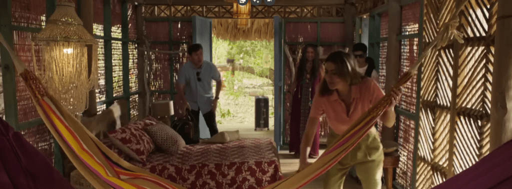 Na verdade, as férias dos pobres, o local onde eles iriam ficar, não é nem pobre, e aí tem outra boa crítica social foda do filme. É apenas uma pousada ecológica, que gosta de prezar pelo meio ambiente, e quer que você seja um com a natureza, faça atividades tranquilas, relaxantes, te ensina a pescar, dormir na mata, ficar bem na frente da praia e só pede para você limpar as coisas. Um conceito bem ok na verdade, super em alta. Eu não iria, pois varrer casa nas férias e dormir numa oca não é pra mim, mas entendo o encanto. Olha que coisa bonita: